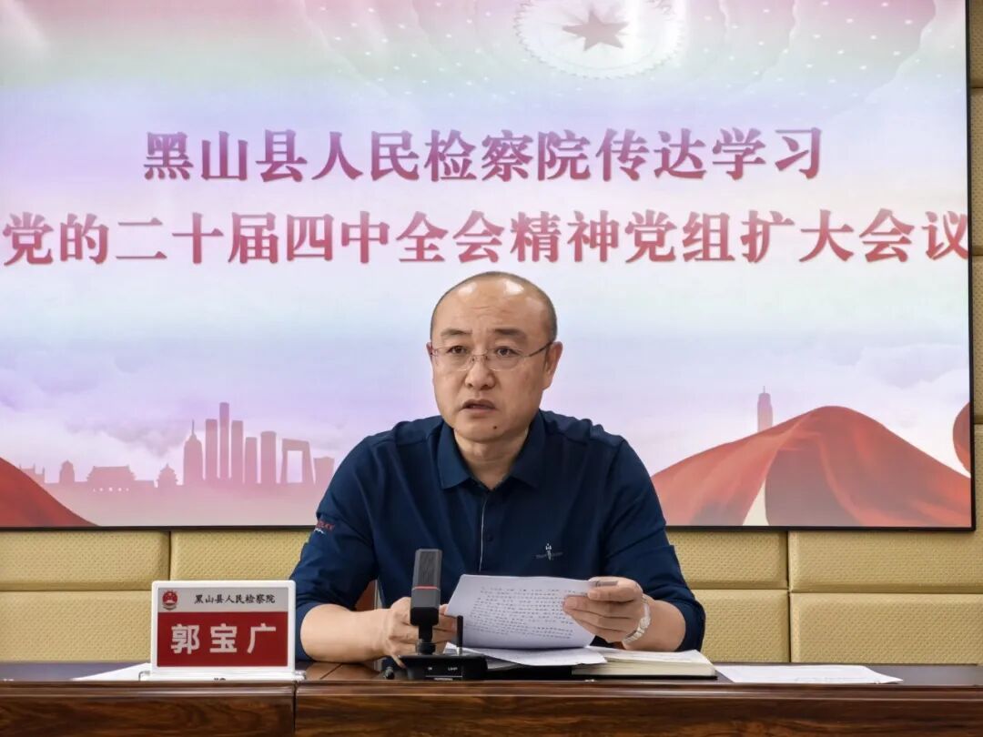 11月5日下午,黑山县人民检察院召开党组(扩大)会,传达学习党的二十届四中全会精神及上级检察机关相关部署要求。党组书记、检察长郭宝广带头领学,并分享个人学习体会。院领导班子成员及中层副职以上干部参会。